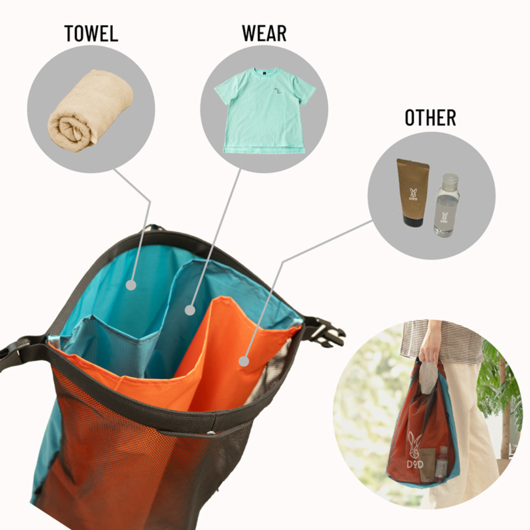 A stuff bag that can be divided into three sections for clean clothes, dirty clothes, and small accessories .
