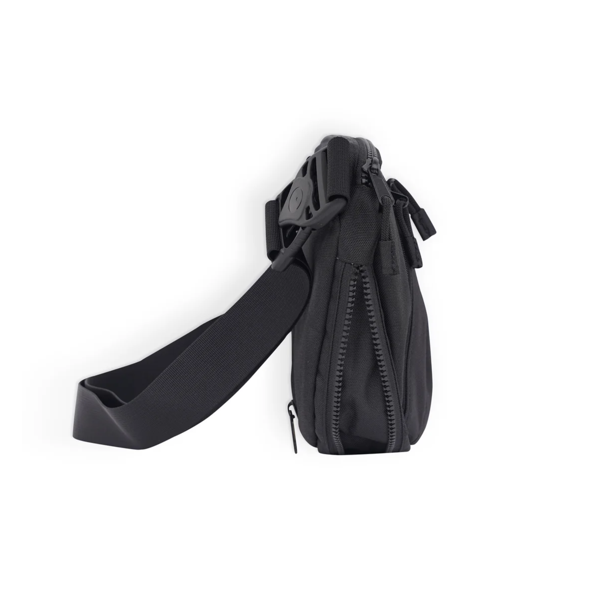 Semi padded sling pack with depth expansion zipper, one adjustable webbing shoulder strap with plastic side release buckle, main compartment with zip closure, two front zip pockets (one fleeced lined for phone), one back zip pocket with webbing detail, one internal zip pocket and two mesh stash pockets, rope loop zip pulls.