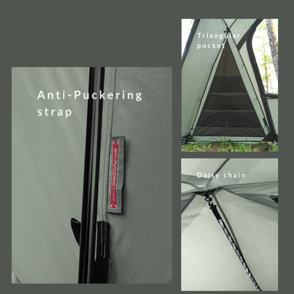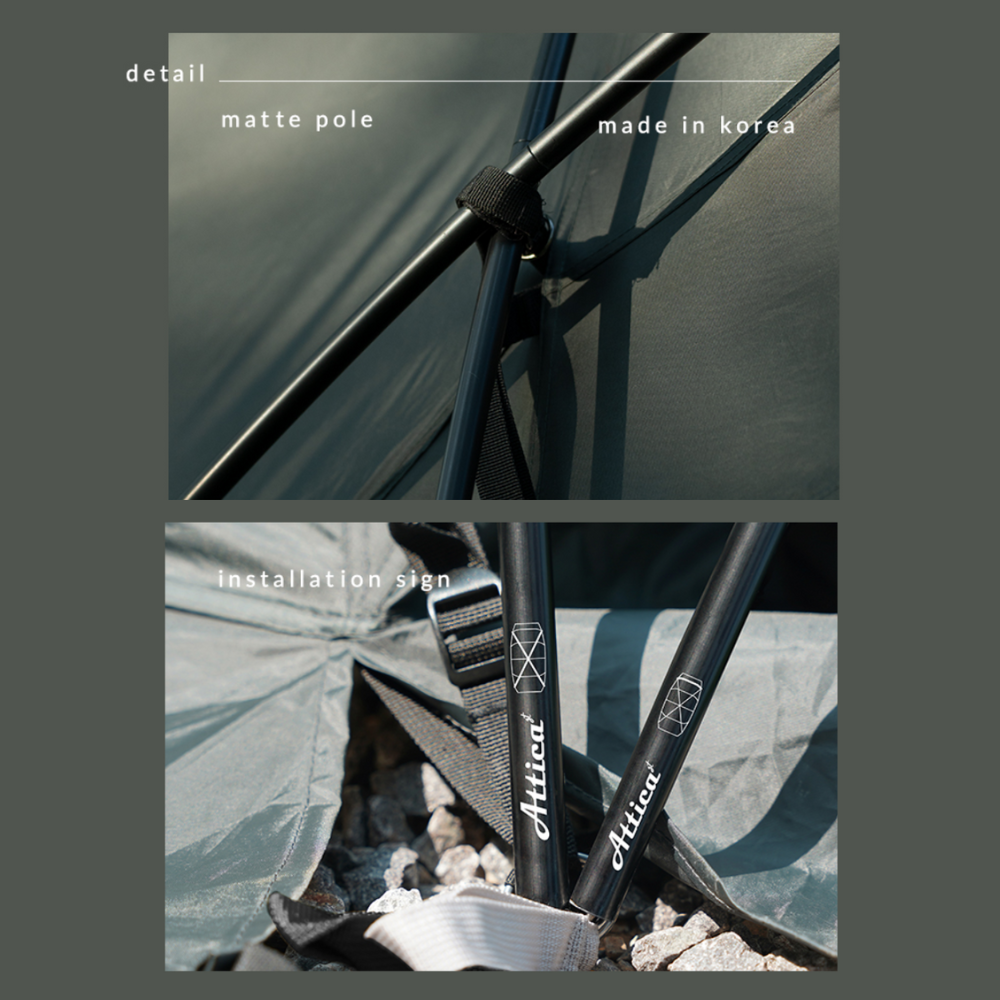 - Component : Main tent, Inner tent, Roof, Ground sheet, Triangular pocket, Daisy chain, Main poleX2ea, Front·Back poleX2ea, Center pole, Inner pole, Canopy poleX2ea, Steel pegX22ea, StringX8ea, Storage bag
