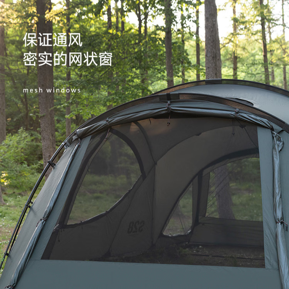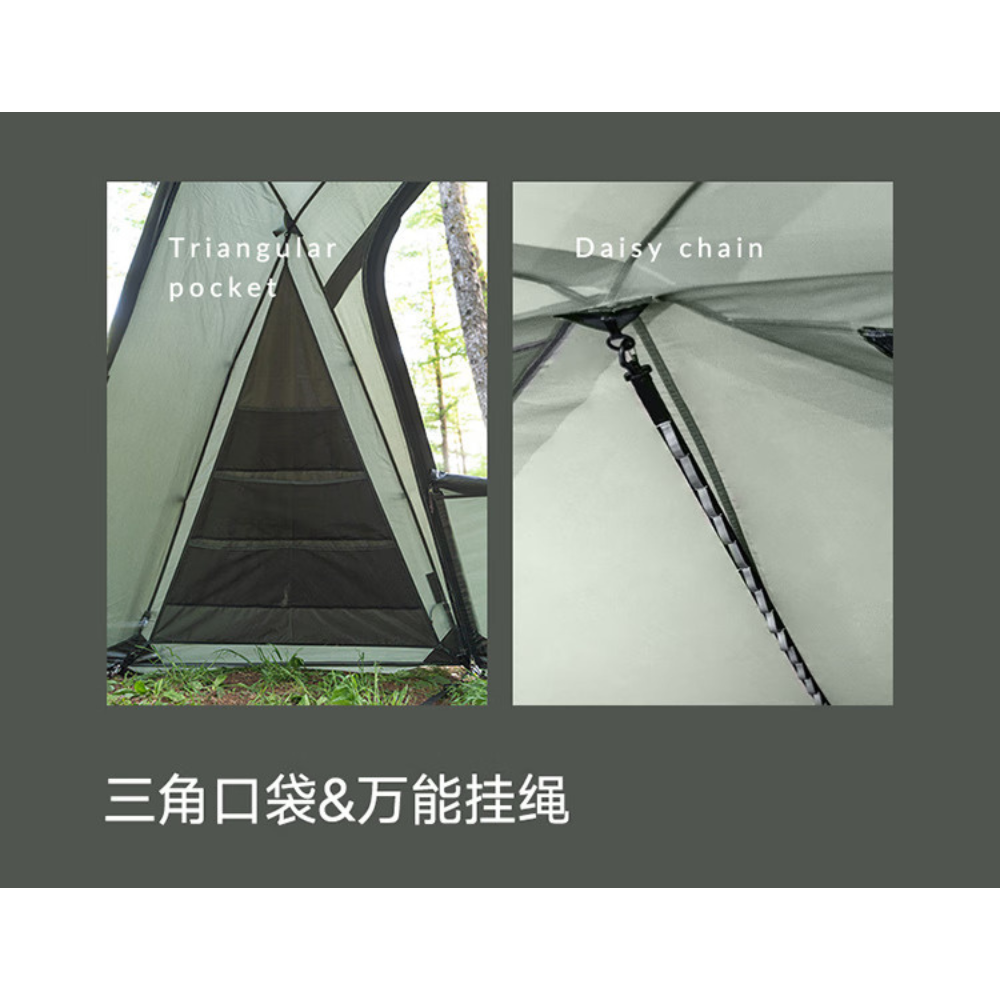 - Components: Main tent, Inner tent, Roof, Ground sheet, Center pole, 2x Front/rear pole, 2x Side pole, Inner pole, 2x Inner ridge pole, 2x Canopy pole, triangle pocket, daisy chain, 26x Steel peg, 10x Strings & Storage bag