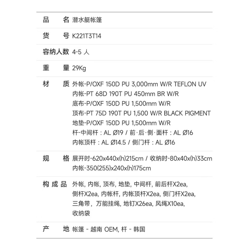 - Main tent: P/OXF 150D PU 3,000mm W/R TEFLON UV