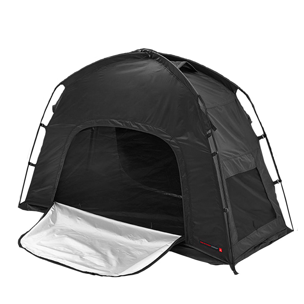 It is a coat tent that can be installed on top of a bed in a night shop and does not come in direct contact with the cold and uneven ground. It can be installed simply and easily with only two poles, and the high-strength aluminum 7001 poles (Ø8.5) provide strong support for the tent. The double canopy system that covers the front as well as the top creates your own private space, and the angle can be freely adjusted to provide wide and perfect shade.