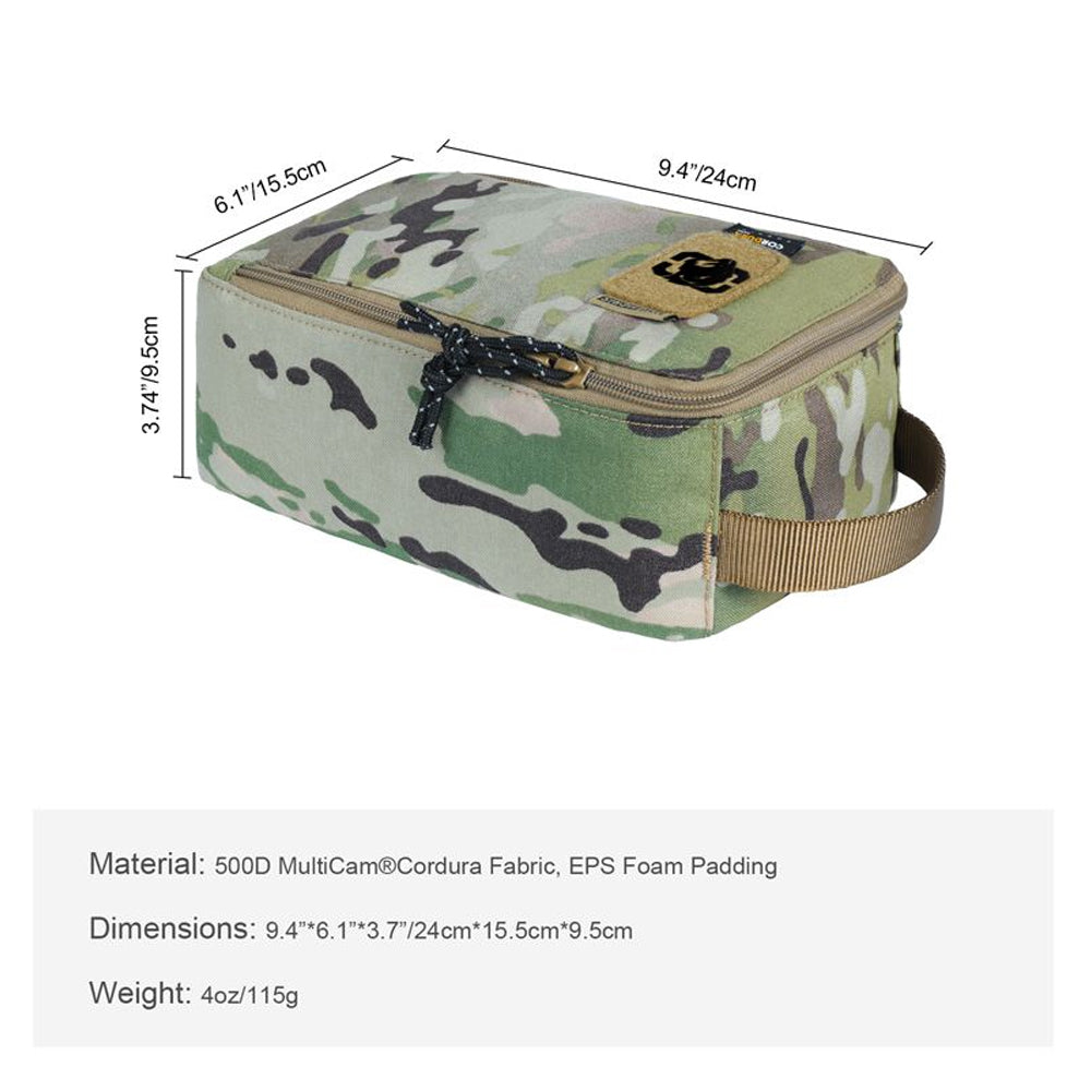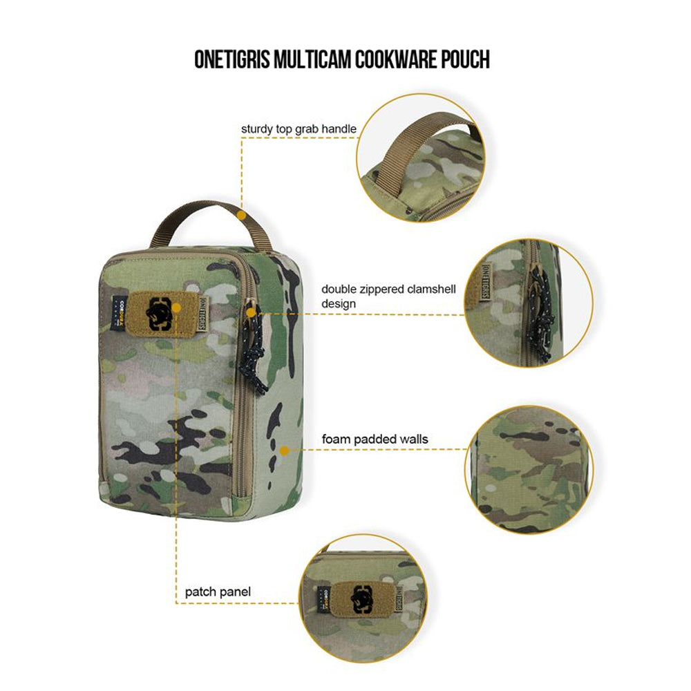 This beaut in multicam is a compact organizer pouch, perfectly sized for storing individual meal kits for the outdoors. Measuring at 24cm by 15.5cm by 9.5cm, it can neatly hold a set of camping pots and bowls, utensils and some spices. Using US licensed 500D MultiCam® Cordura with foam padded walls, the pouch will keep all contents snugly stored while offering easy access through its double zippered clamshell design. Inside you’ll find just enough space to store outdoor dinnerware, and there are 3 mesh pockets for utensils, matches, and other other smaller items to keep them in place. When zippered shut, the pouch is easily portable with a sturdy top grab handle, and has a patch panel for morale patches or name tags to personalize your gear.